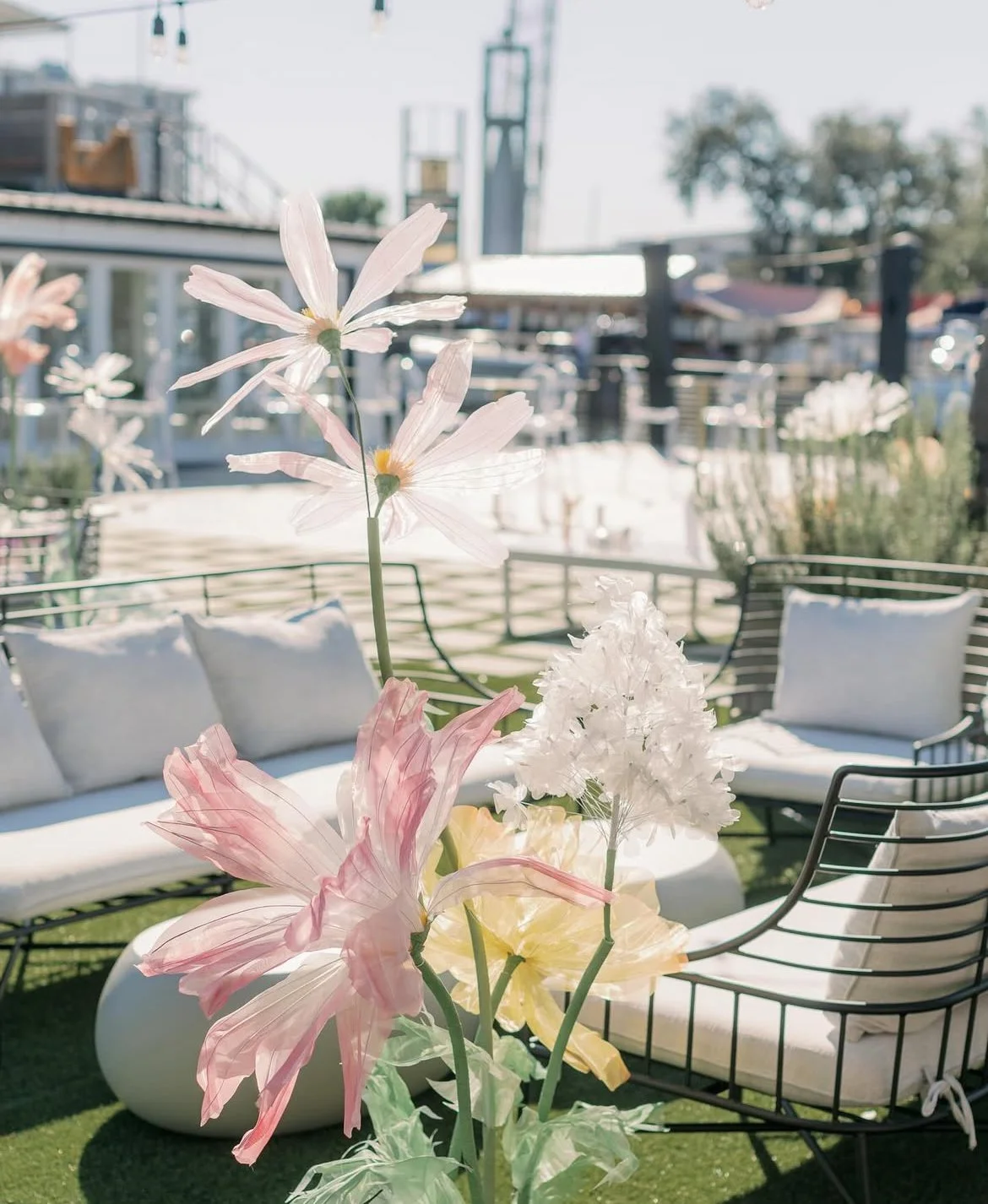 Waterfront venue, modern decor, indoor and outdoor venue space.